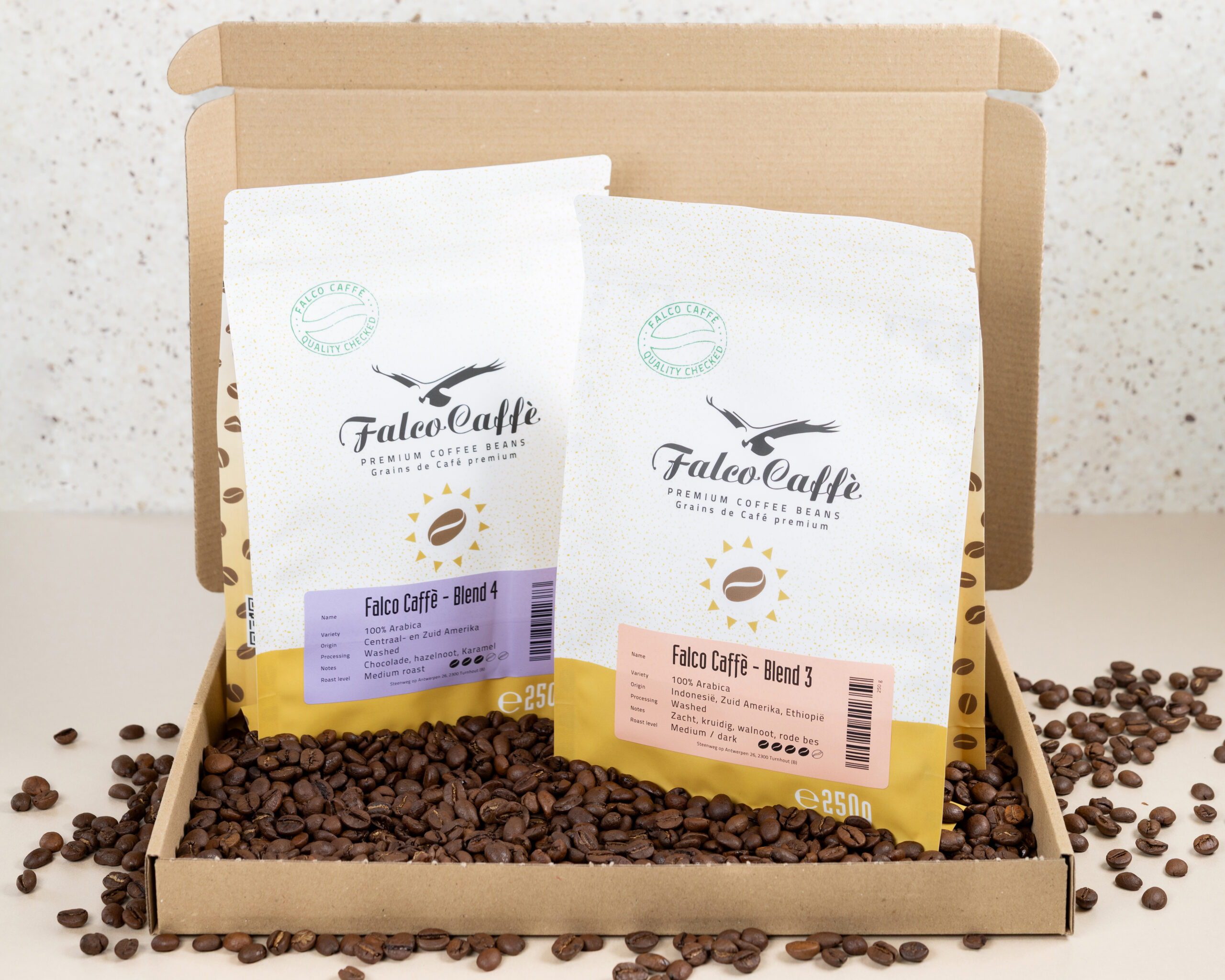 Altijd genieten van jouw favoriete koffie, zonder gedoe? Het Falco Caffè brievenbuspakket is ideaal om onze premium koffie te ontdekken zonder thuis te moeten blijven voor een levering. De vers gebrande Arabica-koffiebonen passen perfect door de brievenbus en worden snel en veilig bezorgd. Ideaal als cadeautje of als voordelige kennismaking met onze zachte, volle smaken.